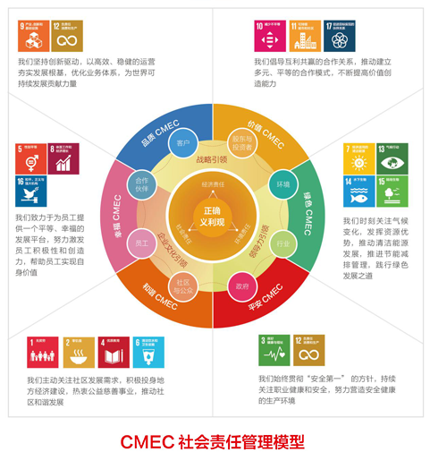 CMEC致力推動聯合國可持續發展目標(SDGs)的實現,以正確的義利觀為核心,結合行業特色、自身優勢和責任實踐,攜手股東與投資者、員工、政府、客戶、行業、合作伙伴等利益相關方,追求經濟社會環境綜合價值最大化,培養責任文化,健全社會責任工作體系,加強責任溝通,為經濟、社會、環境等可持續發展問題提供創新性的解決途徑,努力實現與各利益相關方共同發展、和諧共贏,助力國家、世界實現可持續發展。